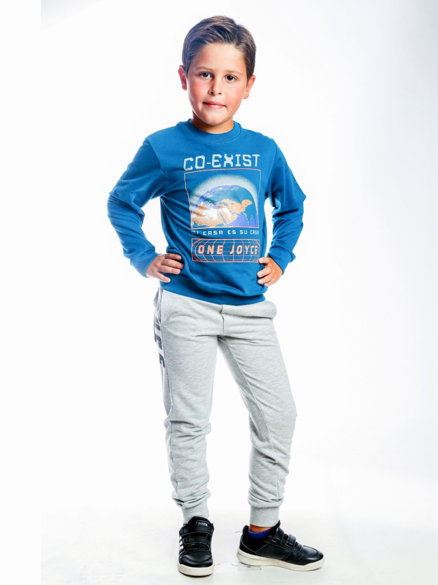 Φόρμα σετ εποχής ανοιξιάτικο γκρι μελανζέ παντελόνι και πετρολ μπλουζάκι με τύπωμα “CO-EXIST”